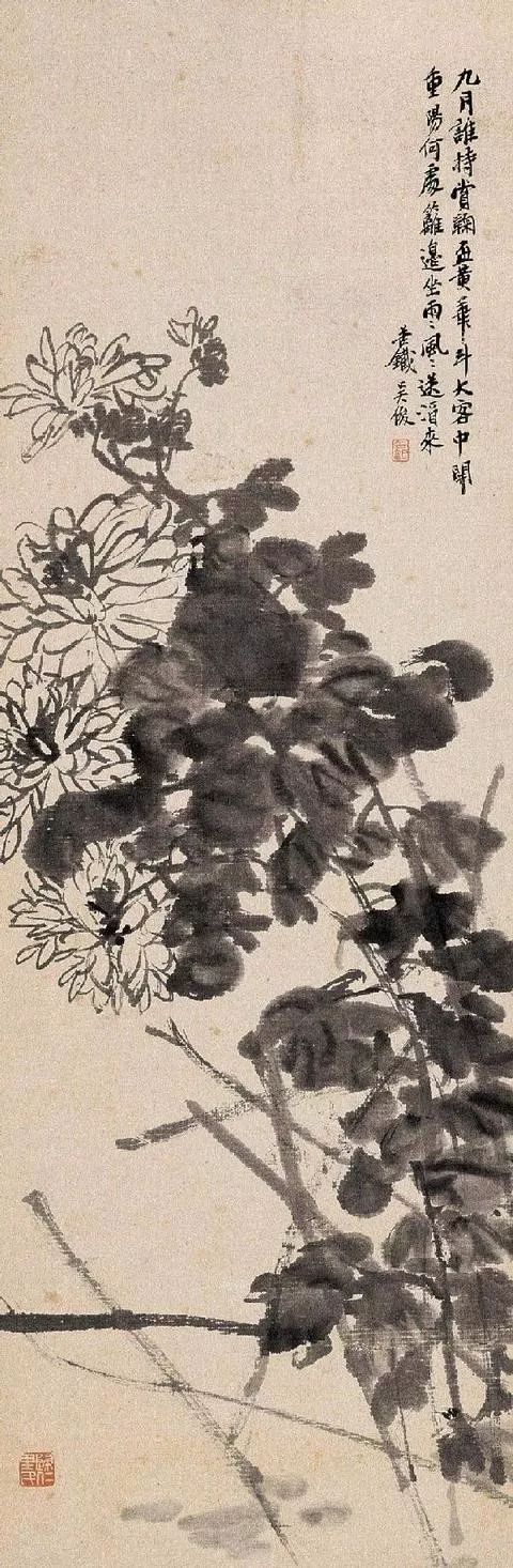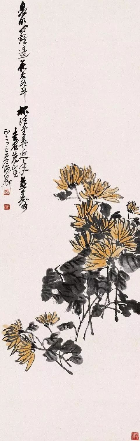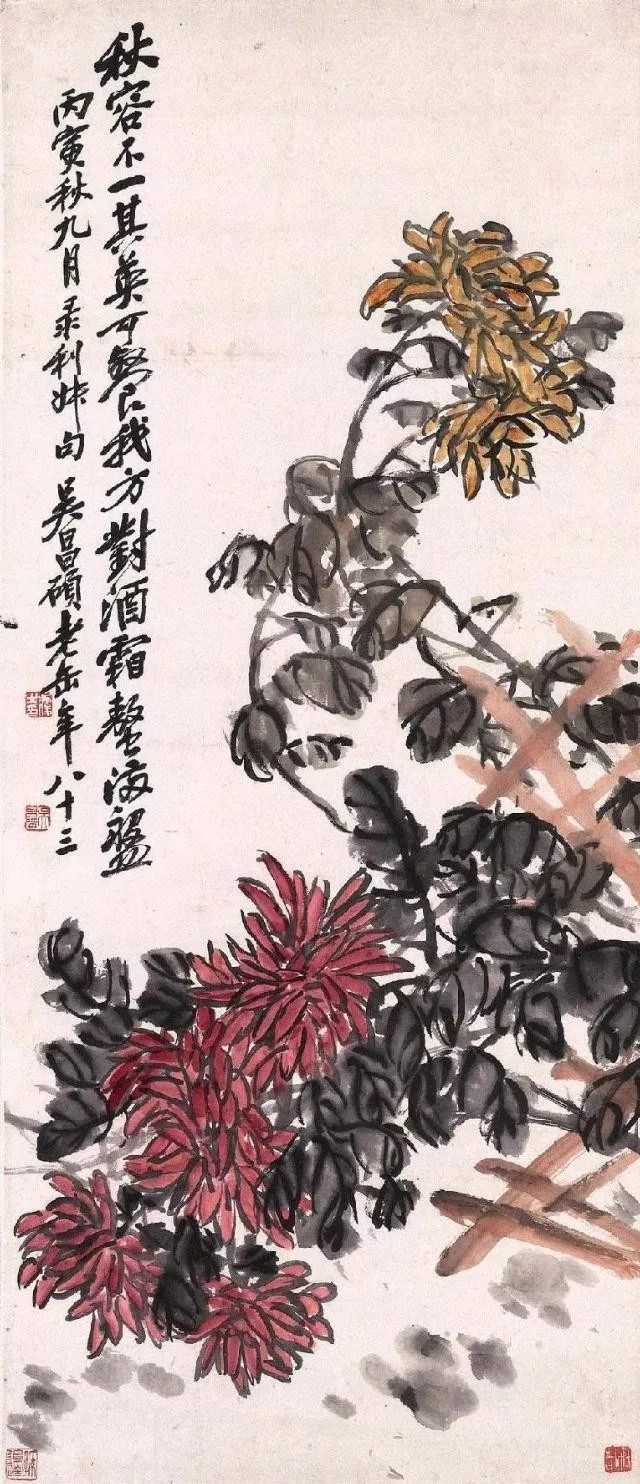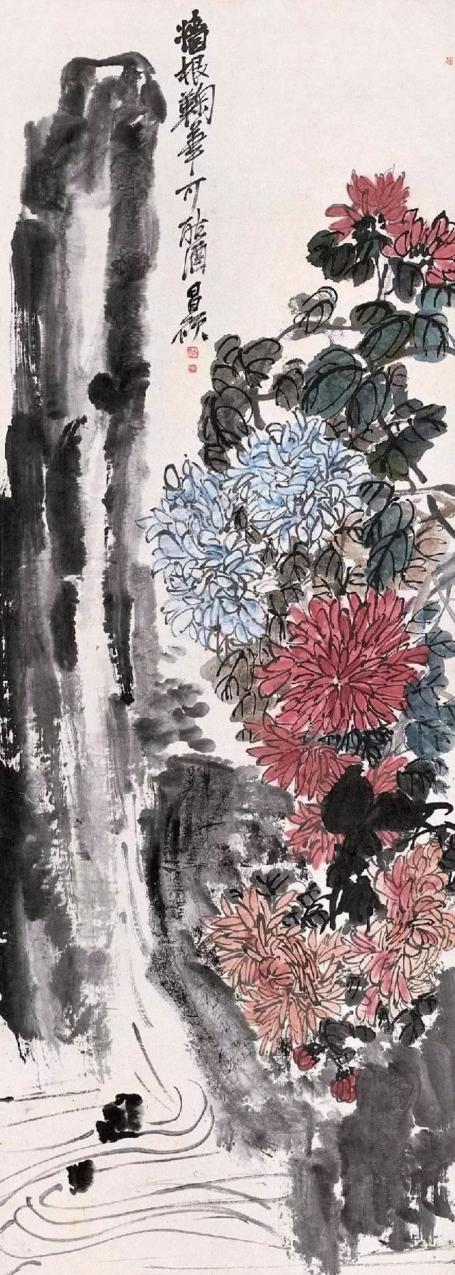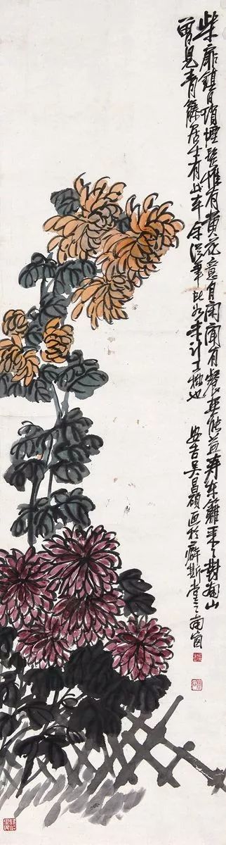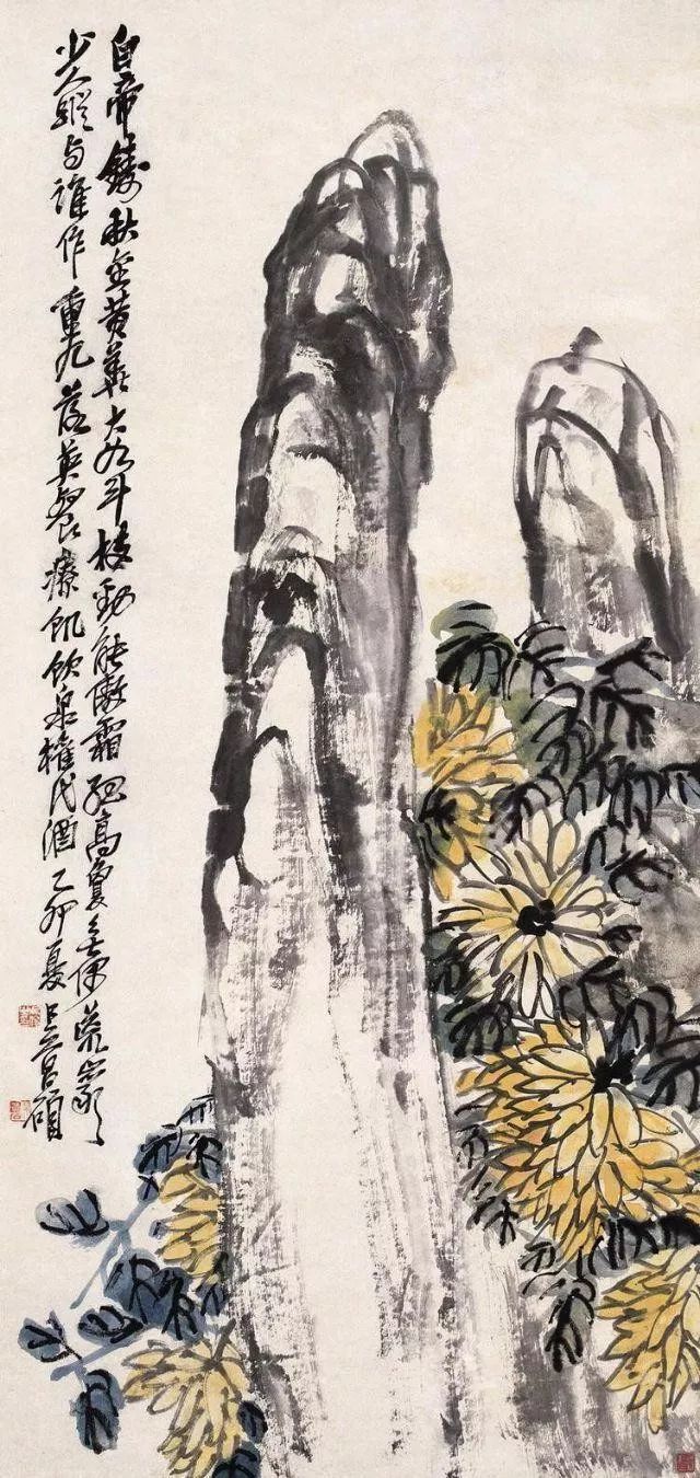 吴昌硕所作之菊,线条凝练遒劲,刚柔并济;墨色浓淡相间,不落俗格。并伴以山岩、野石、溪水,或插入孤高细瘦的古瓶,皆与秋菊幽独淡雅、冷逸傲世的情态相映成趣。