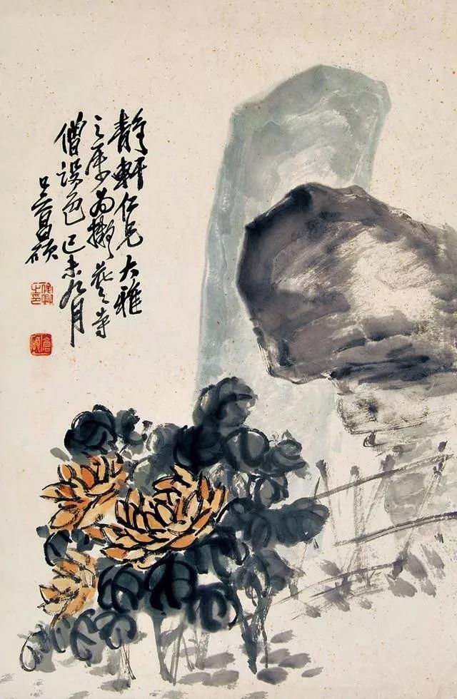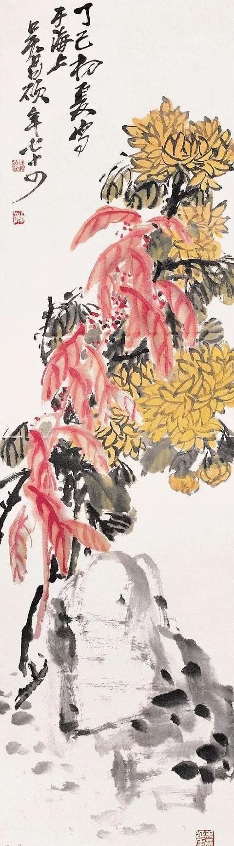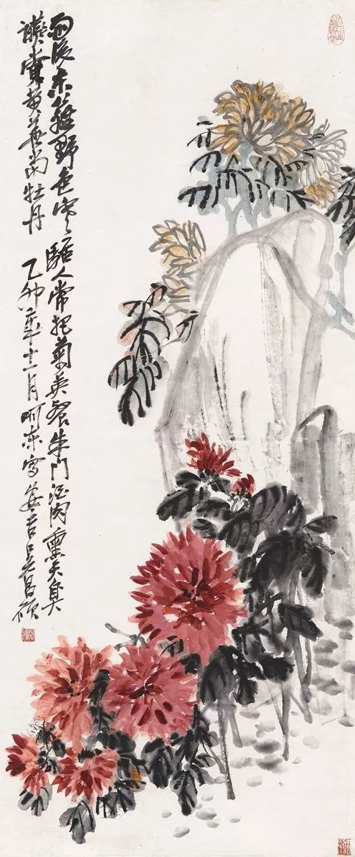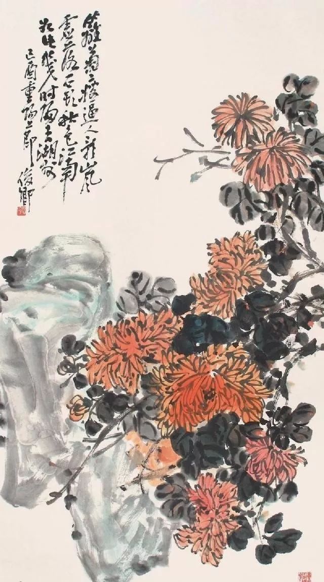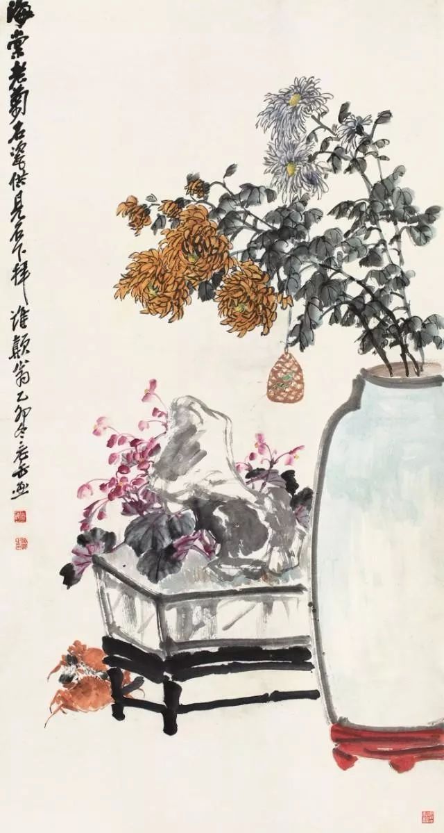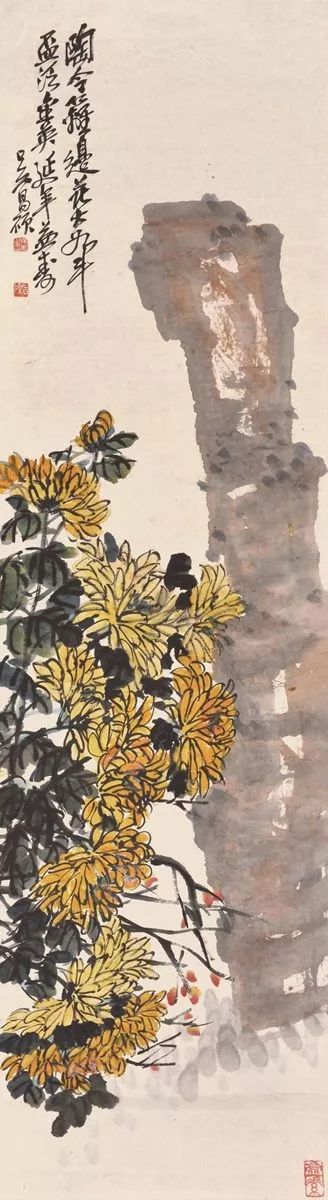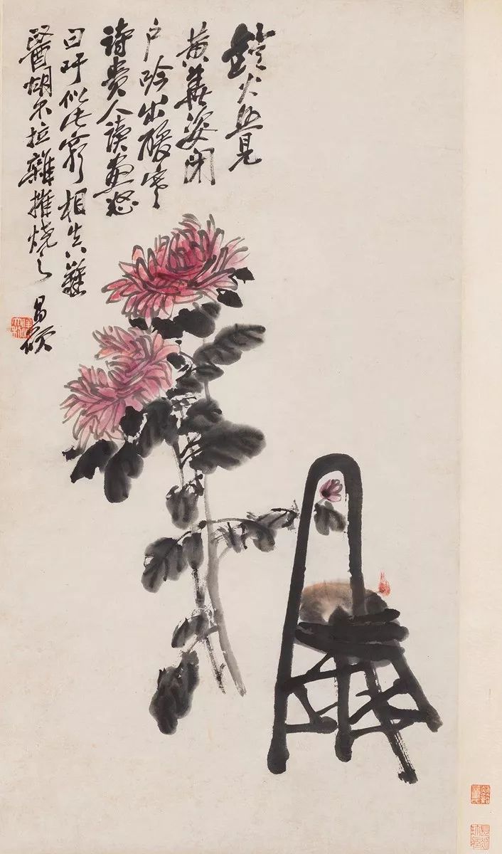 吴昌硕所作之菊,线条凝练遒劲,刚柔并济;墨色浓淡相间,不落俗格。并伴以山岩、野石、溪水,或插入孤高细瘦的古瓶,皆与秋菊幽独淡雅、冷逸傲世的情态相映成趣。