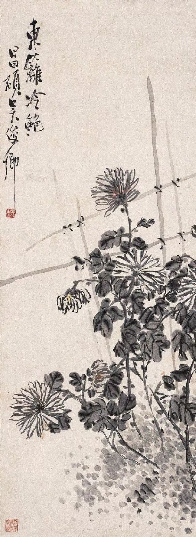 吴昌硕爱菊,他的故乡芜园以及他所居住的厅堂外的篱边,也都种栽有菊花。