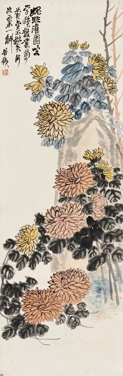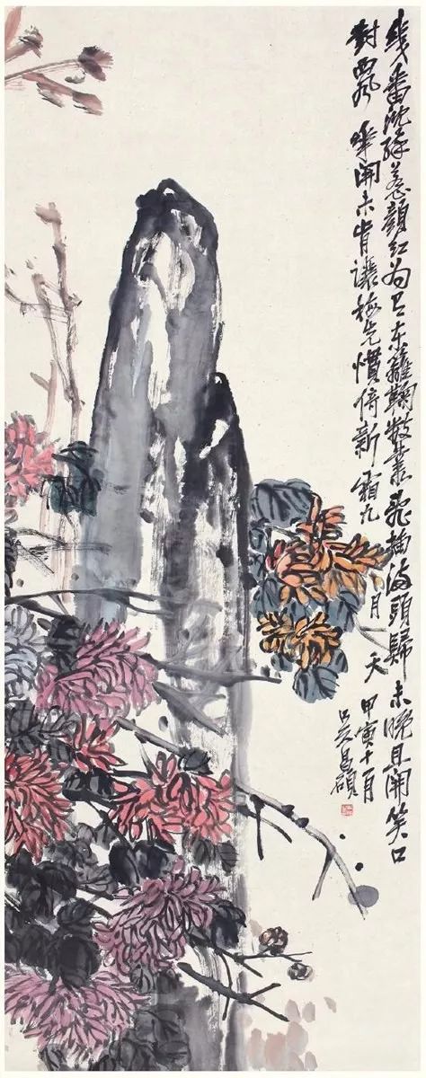 又兼之昌硕将石鼓之意注入,简单的菊花、枝干、石头竟有了一番泼辣疏犷、纵情恣意的气象。