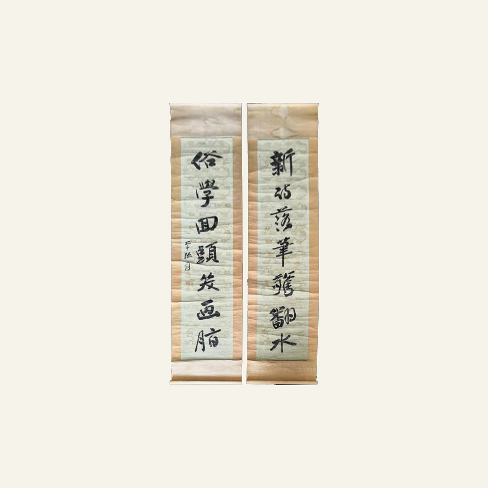 “新诗落笔惊翻水,俗学回头笼画脂”这是张大千常写的一幅对联,字迹潇洒自如,笔锋遒劲有力。作者以精当的语言,运用上下联强烈的对比,说明一个深刻的道理,艺术无止境。一个人要想取得杰出的成就,就必须要先总结过去,抛去那些浅薄趋时的俗学;刻苦努力才不会徒劳无功。次联出自南宋朱松《韦斋集》劵4《送仲猷北归二首》之一“一丘胸此有余师,空此淹留岁月迟。黄墨工夫怜我倦,箪瓢风味要君知。新诗落笔惊翻水,俗学回头笼画脂”。