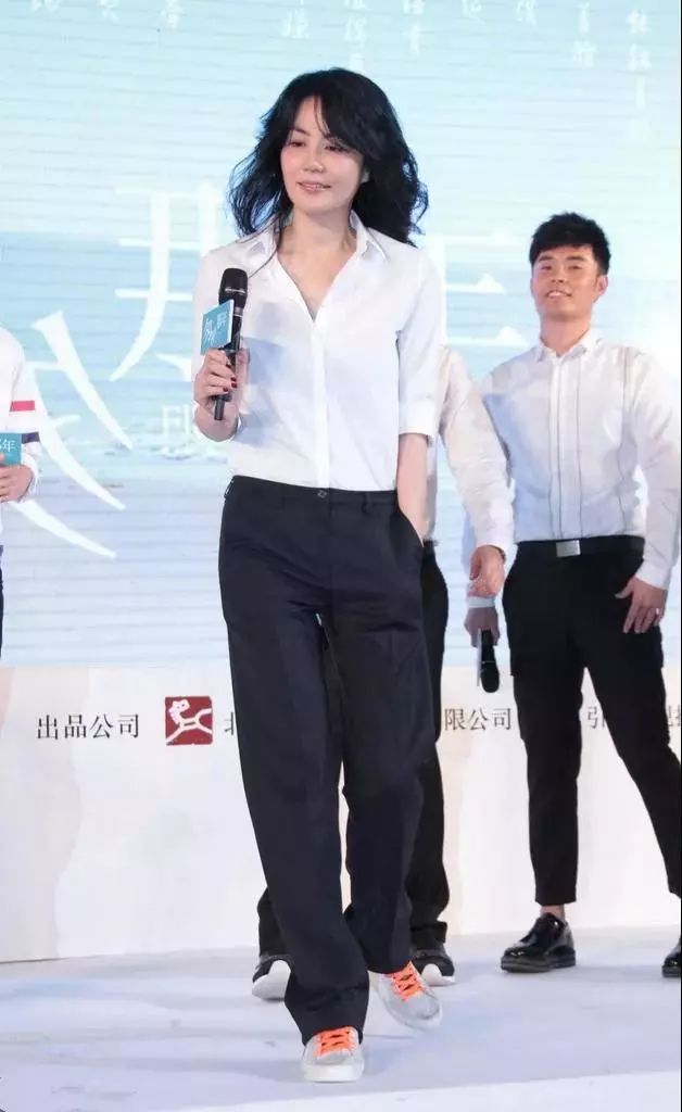 墨羽发现好多女明星到了30岁以后都喜欢穿白衬衣的,比如陈数、俞飞鸿等,白衬衣有一种独特的气质,能将女性身上的那种优雅与干练凸显出来。如果你是一位上班族又不知穿什么,选白衬衣肯定是没错的,王菲一身白色衬衣搭配黑色阔腿裤,V领衬托出锁骨又显瘦,再将袖口卷上去,尽显干练,搭配帆布鞋,休闲时髦。