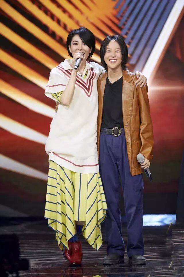 这身白+黑的搭配简直是太潇洒太帅气了,白色衬衣搭配黑色裤子,白色领结一系上,脚踩一双黑色小皮鞋,又man又时髦,而且还顺利的带火了别针耳环,如果王菲还继续唱歌走通告的话,肯定是一位超强带货女明星。