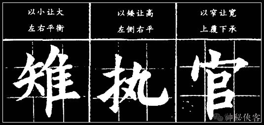 由于字的笔画繁简多寡不同,部首的宽窄高矮不一,不能平均分布位置或简单地堆放,而要用布白调配、互相穿插、互相容让等方法去处理。如前人所说:“高有相让,则能者展之;地有相让者,则要处得势。相让者,让高就卑,让宽就窄,让险就易。然亦须有相助之意为善”。这就是说要避就揖让,做到以短让长、以窄让宽,以小让大,让左侧右、彼此相安。这样才能不拥不挤,不松不垮,争让得势,相映成趣。
