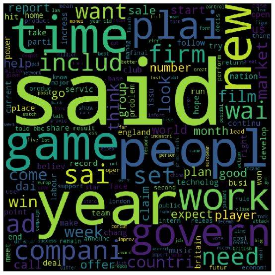 texts = ''for index, item in bbc_text_df.iterrows(): texts = texts + ' ' + clean_text(item['text']) plot_word_cloud(texts)