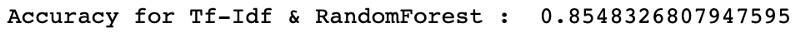 pl_random_forest_tf_idf = Pipeline(steps=[('tfidf',Text2TfIdfTransformer()), ('random_forest', RandomForestClassifier())])scores = cross_val_score(pl_random_forest_tf_idf, df_x, df_y, cv=5,scoring='accuracy')print('Accuracy for Tf-Idf & RandomForest : ', scores.mean())