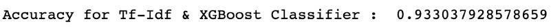 pl_xgb_tf_idf = Pipeline(steps=[('tfidf',Text2TfIdfTransformer()), ('xgboost', xgb.XGBClassifier(objective='multi:softmax'))])scores = cross_val_score(pl_xgb_tf_idf, df_x, df_y, cv=5)print('Accuracy for Tf-Idf & XGBoost Classifier : ', scores.mean())