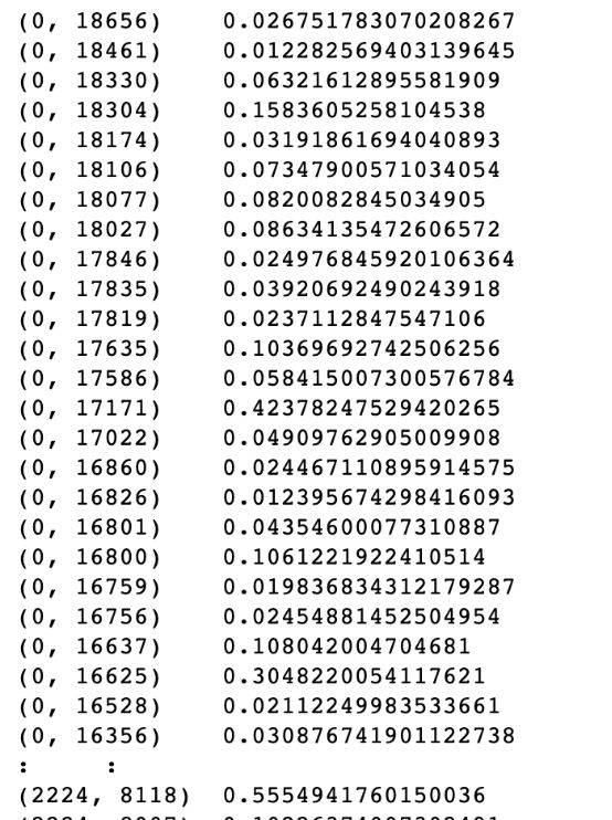 tfidf_transformer = Text2TfIdfTransformer()tfidf_vectors = tfidf_transformer.fit(df_x).transform(df_x)