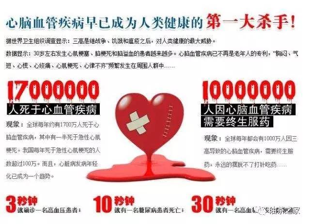 心脑血管疾病是一种严重威胁人类,特别是50岁以上中老年人健康的常见病,具有高患病率、高致残率和高死亡率的特点,即使应用目前最先进、完善的治疗手段,仍可有50%以上的脑血管意外幸存者生活不能完全自理,全世界每年死于心脑血管疾病的人数高达1500万人,居各种死因首位。中国社科院《人才发展报告》七成人有过劳死的危险,大部分人群处于亚健康状态,不久的将来这些人中的2/3死于心脑血管疾病!血脂异常的1.6亿人,平均每30秒,至少有一个人死于心脑血管疾病。