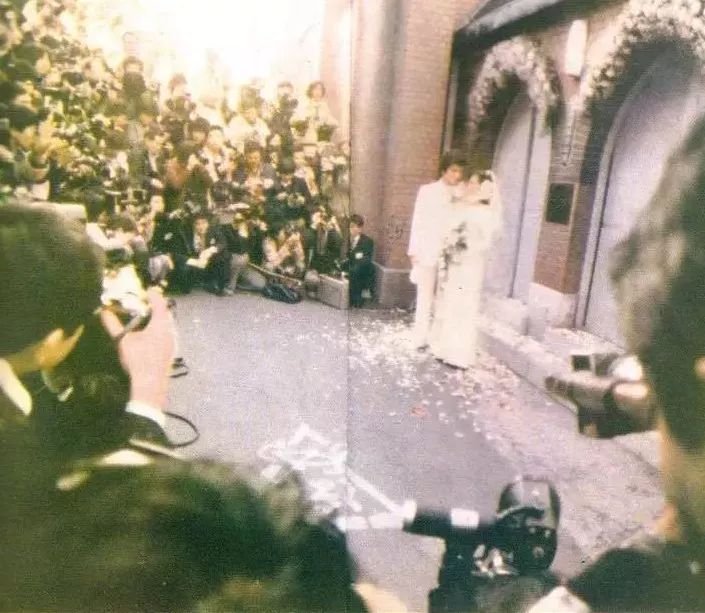 山口百惠与三浦友和的婚礼现场 。1980年10月5日,山口百惠发表引退宣言。1980年11月19日,山口百惠和三浦友和举行婚礼。其后,山口百惠退出娱乐圈。