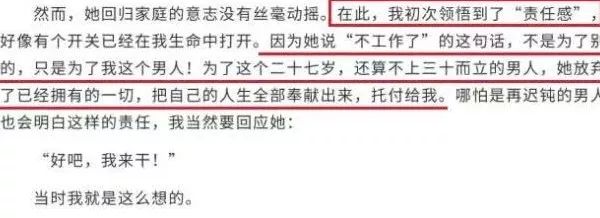 他幸福地说:“好像有个开关已经在我生命中打开。因为她说‘不工作了’的这句话,不是为了别的,只是为了我这个男人!为了这个还算不上三十而立的男人,她放弃了已经拥有的一切,把自己的人生全部奉献出来,托付给我。哪怕是再迟钝的男人也会明白这样的重任,我当然要回应她:‘好吧。我来干!’”