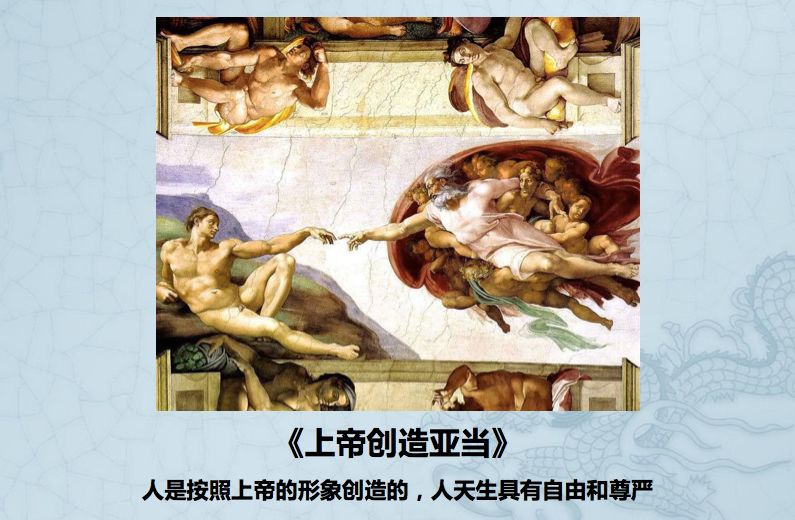 上帝创造亚当,这幅画在梵蒂冈的西斯廷教堂的屋顶,这幅画的核心是说,人是按照上帝的形象来创造的,所以人天生具有自由和尊严,是不可剥夺的。
