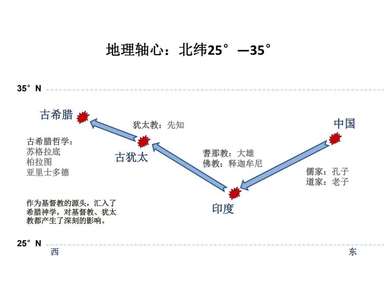 雅斯贝尔斯认为,人类文明最重要的突破就是发生在轴心时代的四种文明,这四种文明都同时发生在同一个时间轴心,即公元前八世纪到公元前两世纪,而且这些文明的突破还发生在同一个地理轴心,就是北纬25度到北纬35度之间。