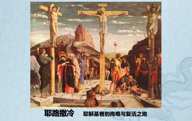 我们看第一幅画,这幅画是摩西带着以色列人出埃及,所以耶路撒冷是以色列人的应许之地,应谁的许?上帝。是神把这块地赐给了以色列人。这幅画代表的是犹太教。