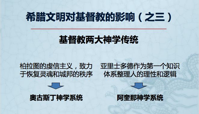 希腊哲学思想深刻影响了基督教神学。我们知道,从基督教早期教父时代以来,基督教神学有两个重要人物,一个叫奥古斯丁,一个叫托马斯·阿奎那。