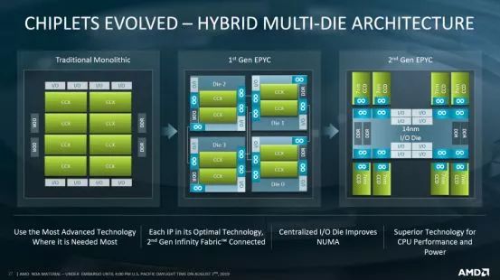 这是Rome最重要的改进之一,即每颗芯片上有一个单独的I/O Die负责输入输出,并集成DDR4内存控制器和PCIe控制器,再通过第二代Infinity Fabric总线连接所有的CPU Die,这部分沿用GF 14nm工艺制造。独立I/O Die的好处是可以降低芯片的设计与制造难度,节省成本,提高良品率。同时,由于I/O Die与所有CPU核心平等连接,无论带宽还是延迟都保持一致,更易于管理,系统、软件调用起来也更方面。