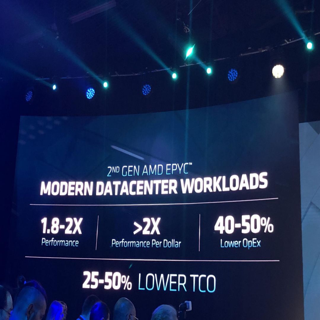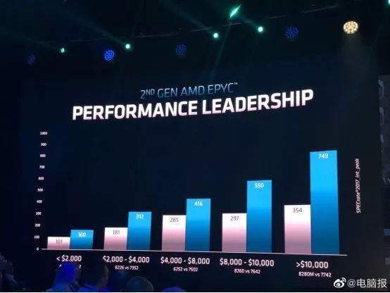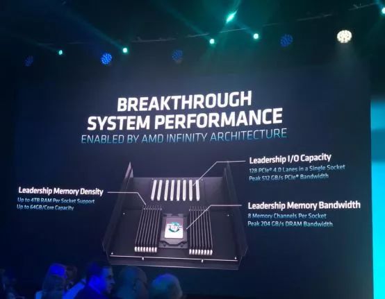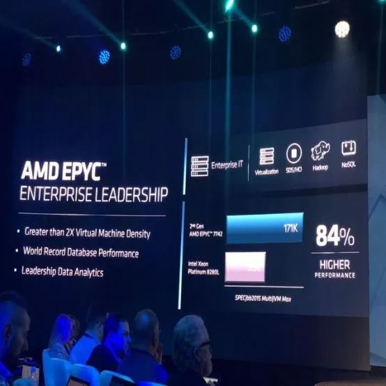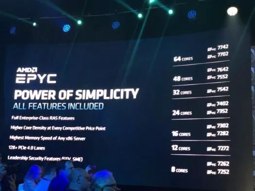 Rome与锐龙三代同为Zen 2架构,最高支持64核心128线程,如此“恐怖”的集成度很大程度上也得归功于台积电7nm工艺带来的高晶体管密度与高能耗比,这也从物理角度决定了高门槛,很难被反超。目前英特尔至强平台的最高规格是28核心56线程,价格极其昂贵,性能却在现场演示中被第二代AMD EPYC(霄龙)系列处理器远远甩在身后。