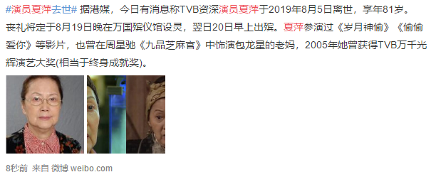 8月12日,据港媒消息,今日有消息称资深演员夏萍(原名卢少萍)于2019年8月5日离世,享年81岁。