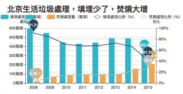 從2 008年到2015年,北京市生活垃圾填埋量減少了超過45%,但焚燒處理量增長了超過1233%。同期,霧霾污染逐漸成為北京的常態。