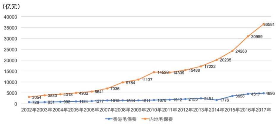 图2 2002—2017年两地毛保费总额