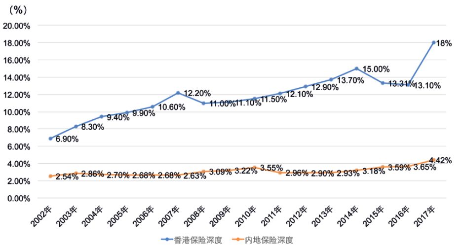图4 2002—2017年两地保险市场保险深度比较
