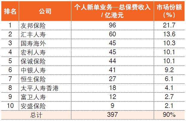 从市场集中度来看,长期业务中约有80%的保额集中在前10大保险公司。以2018年一季度香港个人新单业务-总保费收入来看,前十大保险公司的市场占有率为90%,个人新单业务总保费收入为397亿港元,见表1。