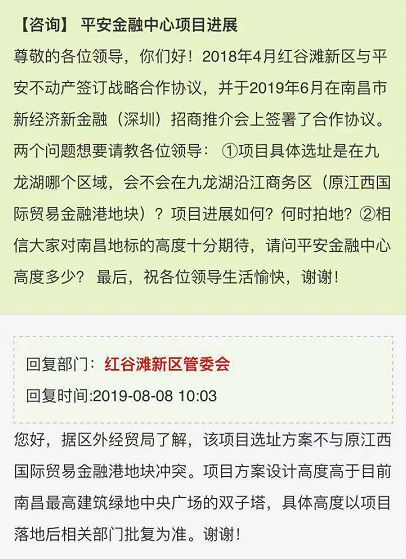 近日,有网友咨询南昌平安金融中心项目具体选址是在九龙湖哪个区域?是否在原江西国际贸易金融港地块?以及高度多少?