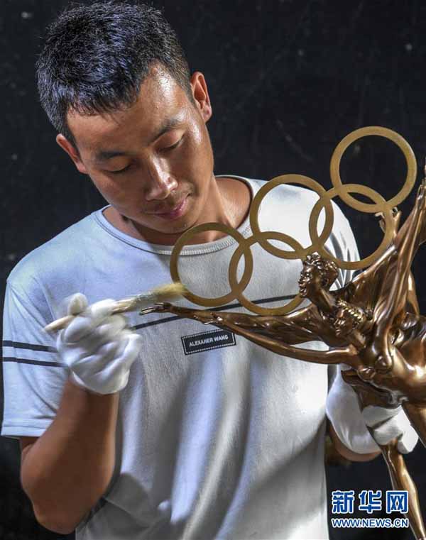 8月12日,在河北省饶阳县华日青铜文化产业园,工人给青铜雕塑半成品打蜡。 河北省饶阳县华日青铜文化产业园成立于二十世纪90年代,经过20余年的发展,形成了以设计生产各类雕塑艺术品为主的现代文化产业园。目前该园区从业人数200余人,产品销往全国100多个城市,并远销美国、德国、日本等国。 新华社记者 李晓果 摄