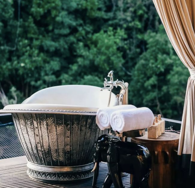 帐篷内的手工艺家具、硬木地板、蚊帐网眼纱和马灯,给人一种19世纪探险远征的感觉。豪华的特大号双人床占据了帐篷的一侧,而一个手工制作的铜浴缸则被放在了房间的中央,黄色的内侧和雕花的外表都极为贵气,足够两个人一起使用。