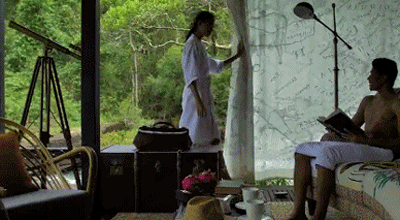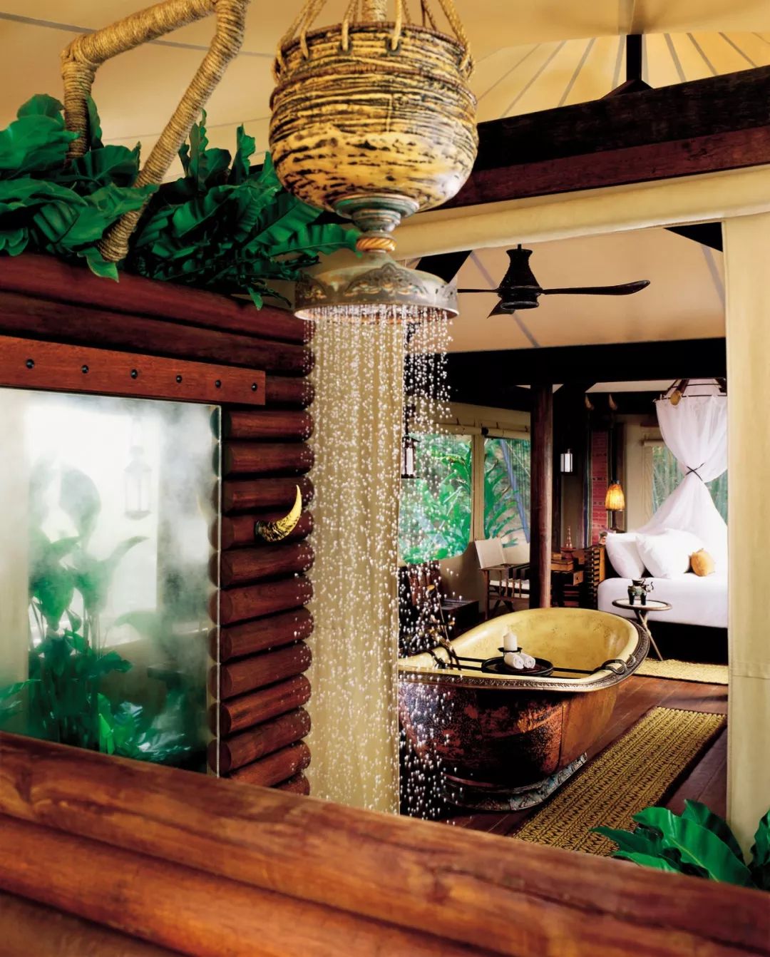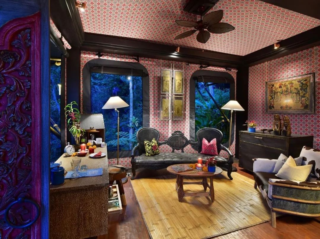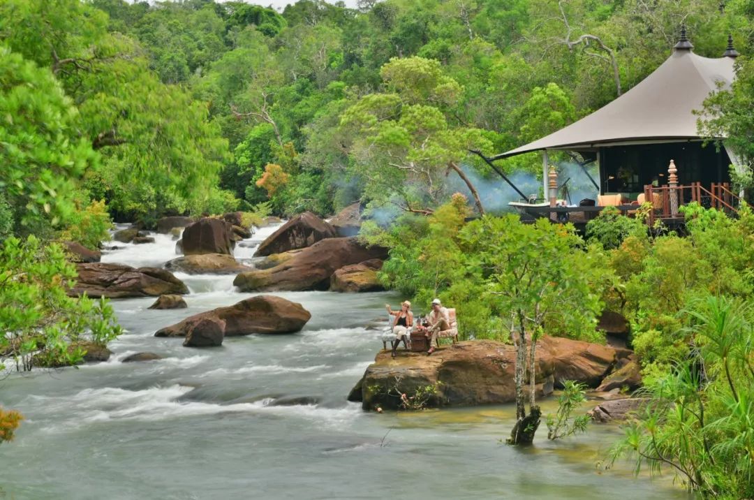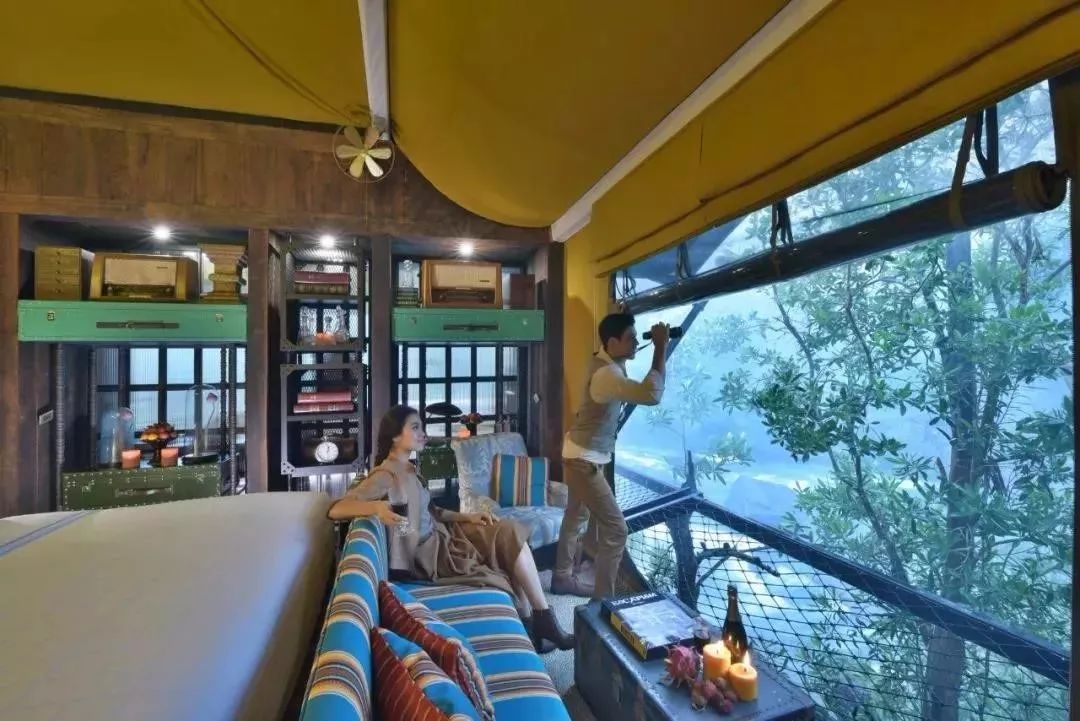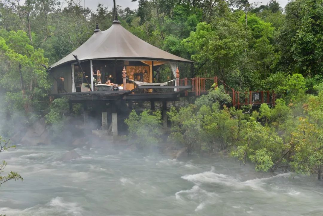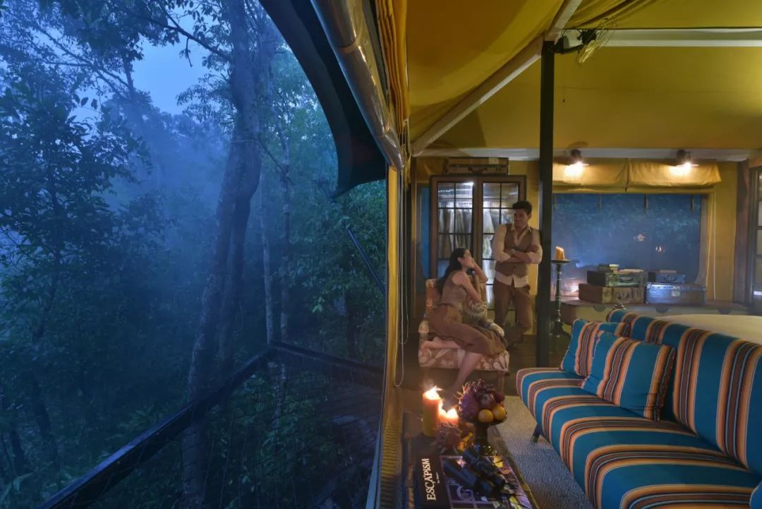 营帐内部是色彩多变、带有丛林探险风格的华丽家具摆设,外面则是浓密的森林与澎湃的瀑布。