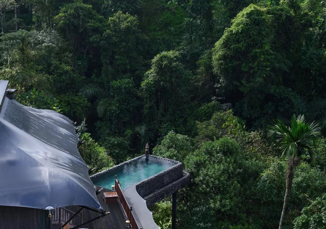 整个度假村在建造的过程中没有破坏森林中的一颗树木,设计师施展了魔法般让22顶帐篷式别墅完美地镶嵌在乌布的葱郁山林中。