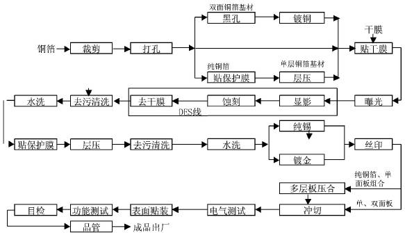 目前,柔性线路板生产流程主要包括开料、钻孔、VCP、镀铜、贴干膜、曝光、显影、蚀刻、去干膜、去污清洗、贴保护膜、层压、纯锡、镀金、丝印、冲切、电气测试、补强胶片贴合、功能测试等工艺。具体工艺流程见图: