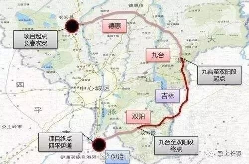 长春经济圈环线高速公路(东环段)起于农安县迟家店,主要经由德惠、九台、永吉、双阳,止于抚长高速公路伊通北,路线全长 207 公里,采用双向四车道高速公路标准建设,总投资135亿元。九台至双阳段开工后,农安至九台,双阳至伊通段正在开展土地预审工作。
