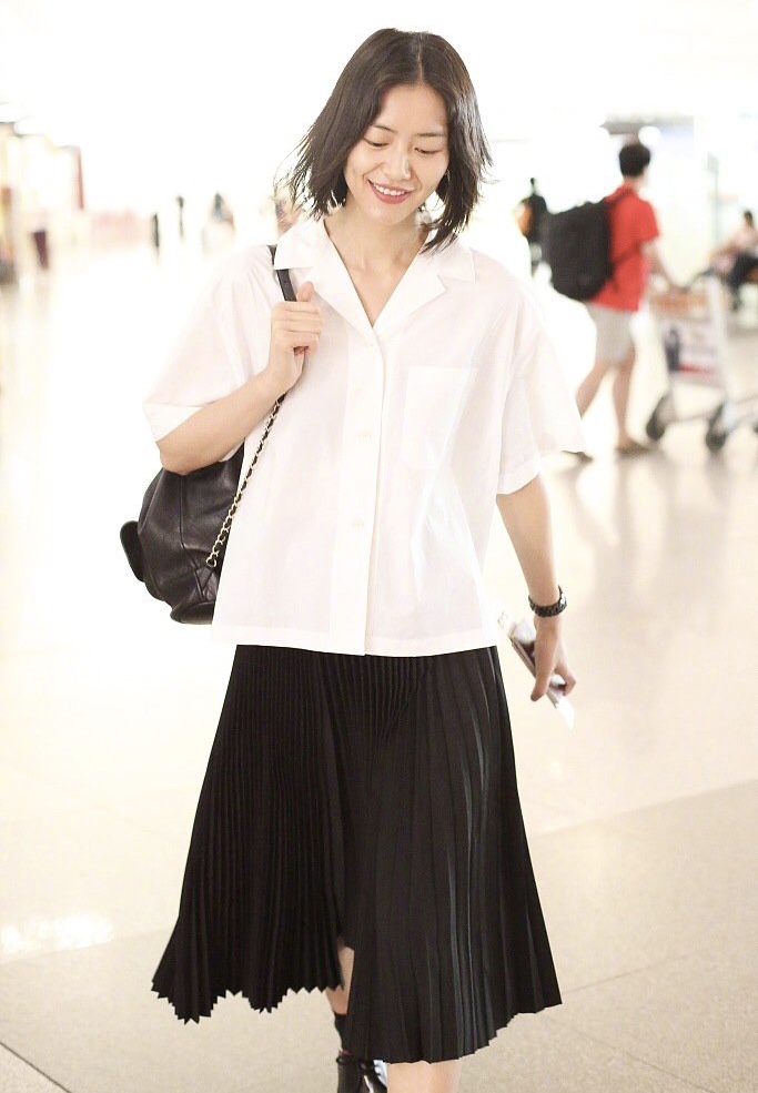 今天刘雯也是稍微改变了一下穿衣风格,白衬衫搭配黑色的百褶裙,黑色的小皮鞋和黑色的小双肩包,一头干脆利落的短发,满满的学生风,今天的大表姐仿佛只有18岁。