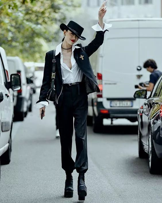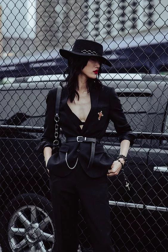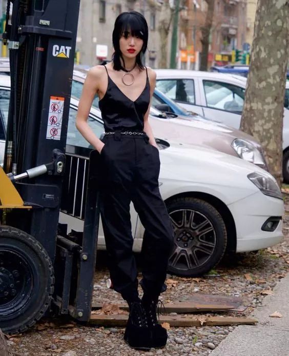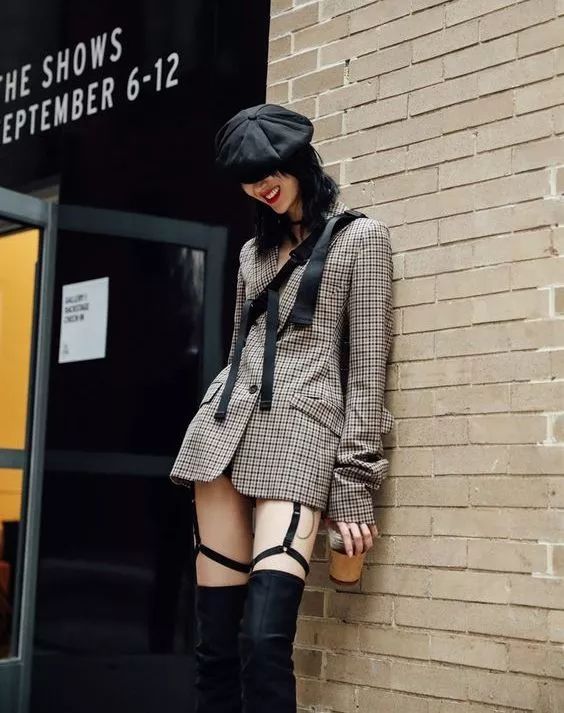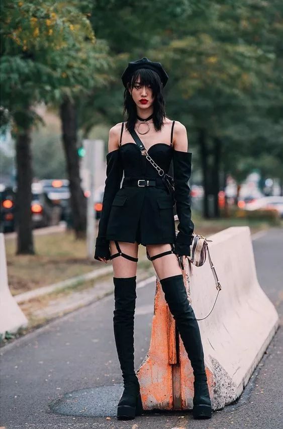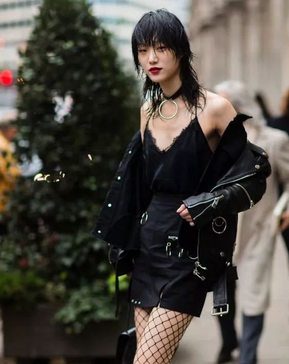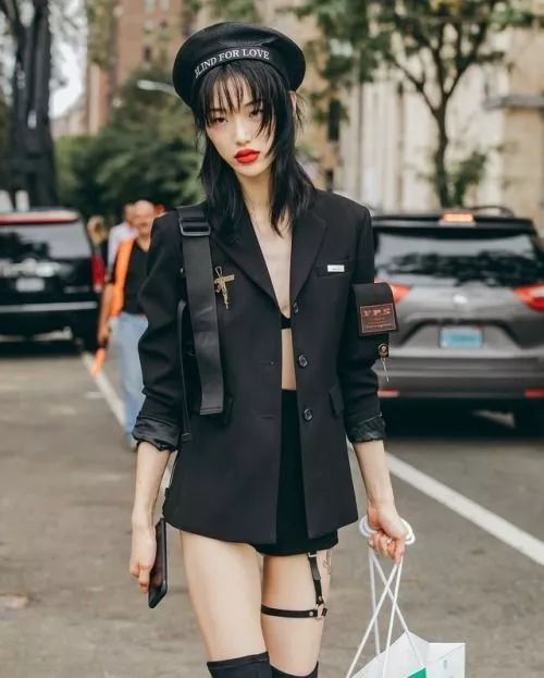 崔素拉的暗黑系朋克风,是时装周期间场外街拍摄影师们的心头爱,充满着高辨识度的穿衣sense也为她圈了不少的粉,黑衣红唇、chocke、过膝袜、网袜、厚底马丁靴都是被她反复使用的单品,在她身在就是凛冽的味道,但是不是所有人都能够效仿的来。