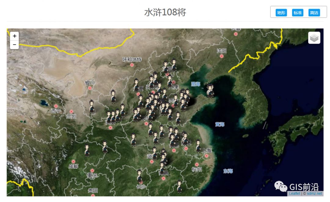 地图以108位好汉的籍贯信息为基础,将其标注到地图上进行查询展示。可以查询到108将的排名、信号、绰号、兵器、照片、职业、梁山职务、上梁山原因、主要事迹、最后归宿等信息。