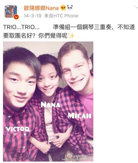 欧阳娜娜李泽宇还有Micah三个人在柯蒂斯期间是演出组合,长期一起上学排练,欧阳娜娜微博也晒出过三个人的合影。