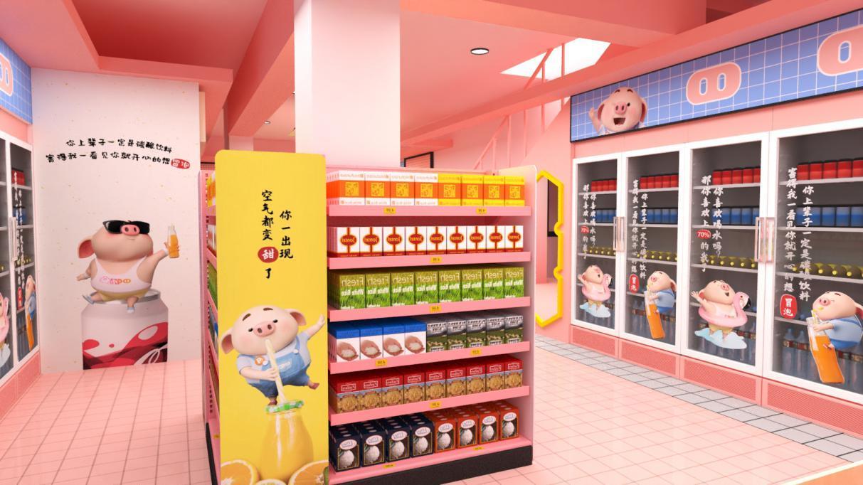 冷饮柜也换成了清一色的粉色主调,还贴上了与收银台颜色一样的猪小屁蓝色主题贴画,两相呼应。在冰柜们上也贴上了猪小屁饮料主题语录,时刻撩动心弦。