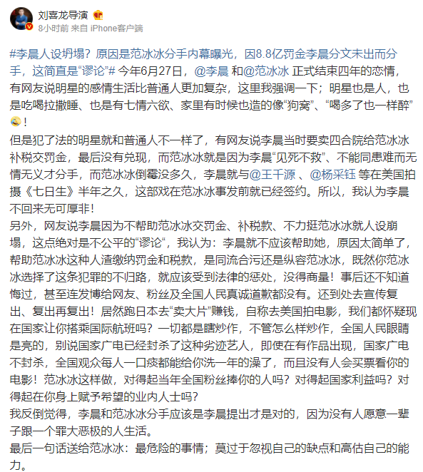 这件事情发生之后,著名导演刘喜龙还在微博伤公开的针对这个事情发表了自己的看法,他表示这个分手理由应该是李晨提出来,李晨去拍戏是因为合同是之前签好的,为什么不去,之后的还钱,李晨并没有义务去还钱。在最后还送个了范冰冰一句话,表示:最危险的事情;莫过于忽视自己的缺点和高估自己的能力。这句话可是引起了粉丝的一种好评。刘喜龙导演为什么说出这番话呢?看看他的背景就知道了,中国电影电视技术学会化妆委员会副秘书长。吉林电视台电视综艺栏目《都市嘉年华》导演。《美动亚洲新势力大赛》主席 。《国际时尚电视》时尚导演金奖 。全国影视艺术《金尚奖明星颁奖盛典》总策划、总导演。而且还担任过国家级的评委,所以他的认知程度是从大局出发的,他也敢于说出这句话。看来范冰冰在中国复出的前路还是有点渺茫啊!