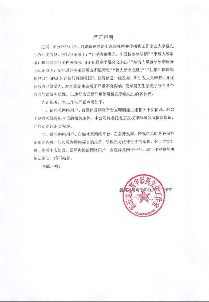 事情发生之后,因为转发效率过快,李晨也是分分钟就上了热搜,其实李晨最近人在剧组拍戏呢,所以可能知道的不太快,不过工作室的速度却是很快,迅速的发表了声明,表示这一切都是谣言,谣言中包括范冰冰配酒等等,这对范冰冰来说应该打击也挺大的。从人前大明星都快被骂成陪酒女了。