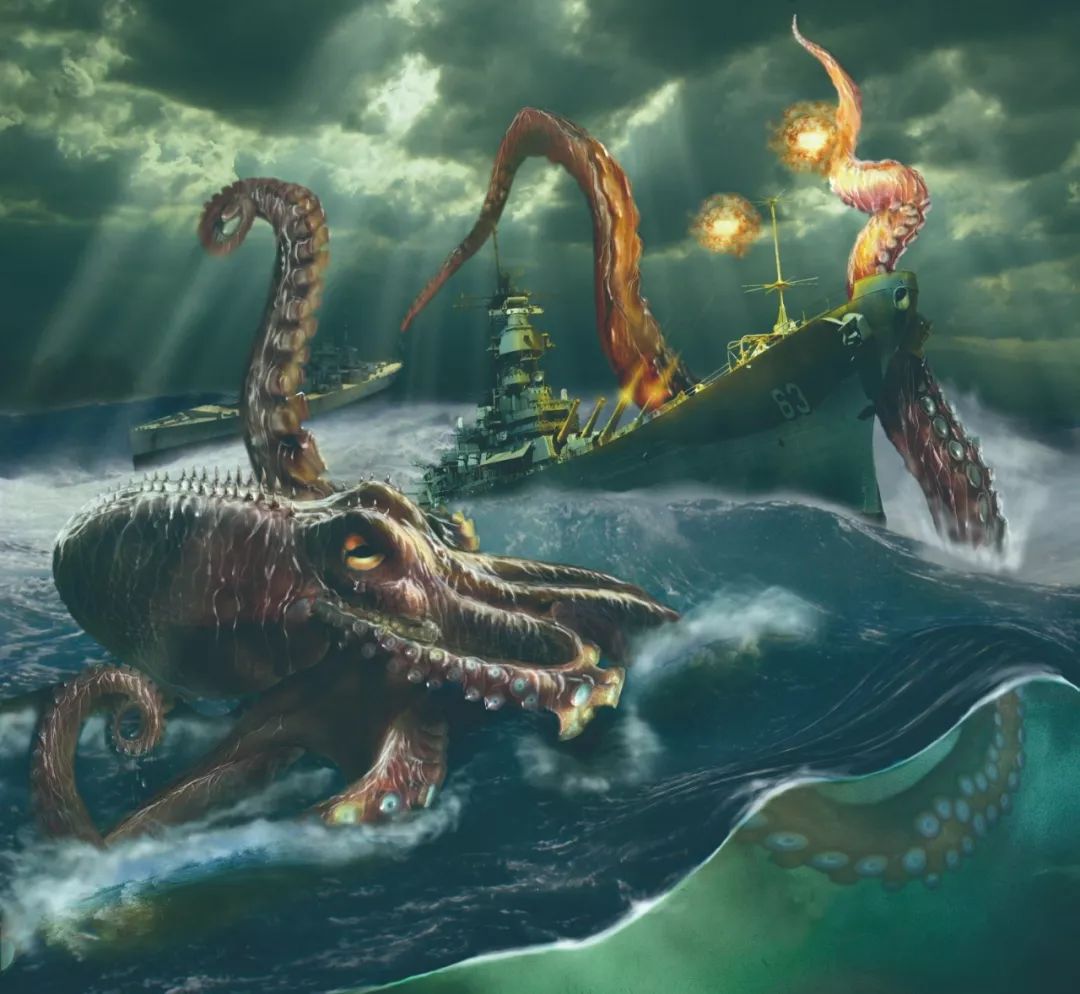 一艘大船正穿越北大西洋的冰冷海域,每个人都提心吊胆,因为这片海域下暗藏杀机,如果不小心吵醒了在海底沉睡的海妖,那么一船人都会葬身海底。船员们小心翼翼,尽量不发出一丁点声响,然而,他们还是惊动了海妖。海妖浮出海面,足足有两三层楼那么高,它挥舞着数十条长达上百米的腕足,紧紧缠住船身,并送入自己的巨嘴中。饱餐一顿后,海妖快速向海底游去,身后只留下一个被它搅起的巨大漩涡。