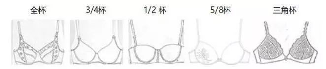 胸罩类型大致分为全杯、3/4杯、 1/2 杯、5/8杯和三角杯这五种。