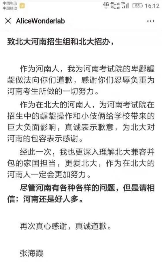 8月14日,张海霞教授公开站出来代替河南考试院向北大招办道歉,在信中写道:”作为河南人,我为河南考试院的卑鄙龌龊做法向你们道歉,感谢你们忍辱负重为河南考生所做的一切努力。作为在北大的一名河南人,为河南考试院在招生中的龌龊操作和小伎俩给学校带来了巨大的负面影响,真诚表示歉意,为北大的包容表示感谢.......尽管河南有各种各样的问题,但是请相信:河南还是好人多......再次真心感谢,真诚道歉。”