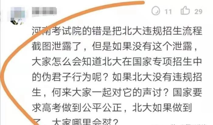很多网友看了之后认为,河南省招办并没有错,用不着道歉。因为这件事情本身就是北大做的不对,如果不公开的话,这两名考生命运就会发生变化。也有网友认为,此事不排除河南考试院故意为之。还有网友认为,这种事情应该公开透明,如果透明的话,或许就不会发生这样的事情。.