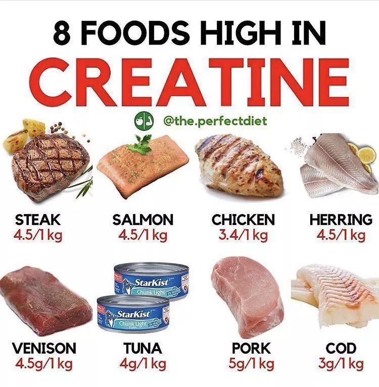 对于人类,大约体内贮存的一半的肌酸都是从食物中获取的(主要来源是鲜肉和鲜鱼)。因为蔬菜不含肌酸,而肌肉肌酸含量随着肌酸摄入的增多而增多,所以素食主义者通常比非素食主义者的肌肉肌酸含量低。