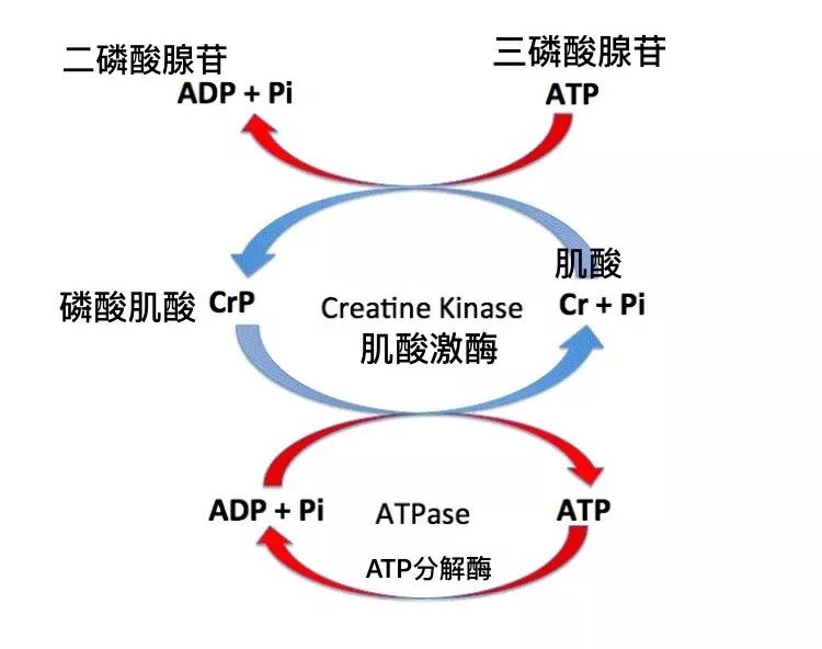 磷酸肌酸分子中含有的高能磷酸键不能被收缩肌直接利用,但运动时在肌酸激酶催化下能将分子内的高能磷酸集团快速转移给二磷酸腺苷而形成三磷酸腺苷。运动恢复期体内氧化产生大量的三磷酸腺苷,再由肌酸激酶催化三磷酸腺苷分子中的高能磷酸基团转移给肌酸重新结合形成磷酸肌酸,所以磷酸肌酸有能量储存库之称号。