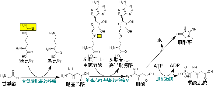 肌酸(英语:creatine),在生物化学中,是一种自然存在于脊椎动物体内的一种含氮的有机酸,能够辅助为肌肉和神经细胞提供能量。米歇尔·欧仁·谢弗勒尔于1832年首次在骨骼肌中发现肌酸.肌酸能够与磷酸肌酸相互转化,在人体内,肌酸主要在肝中利用三个不同氨基酸合成,这三个氨基酸包括精氨酸、甘氨酸和蛋氨酸。合成后95%的肌酸被贮存于骨骼肌中,剩下的存在于大脑、心脏和睾丸中。