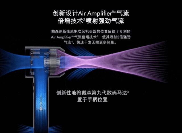 戴森HD01吹风机创新性的把吹风机头部位置留给了专利的Air AmplifierTM气流倍增技术,使其可以喷射三倍强劲气流,不需要太多热量也可以快速把头发吹干,这就防止了过热干发导致的头发损伤。
