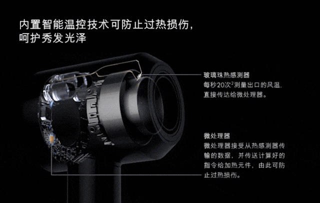 它还内置了玻璃珠热感测器,每秒20次测量出口风温,直接传达给微处理器。微处理器接收到从热感器传输的数据,并传达计算好的指令给加热元件,由此可以防止过热损伤,这就是戴森的智能温控技术。