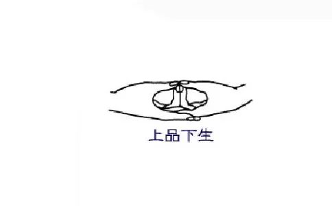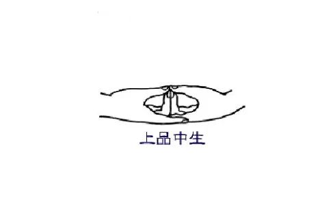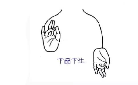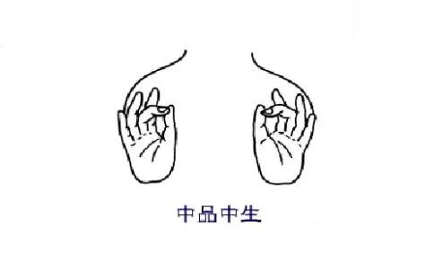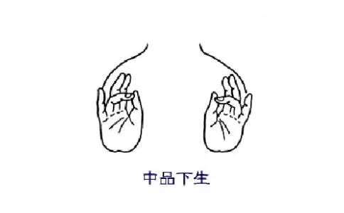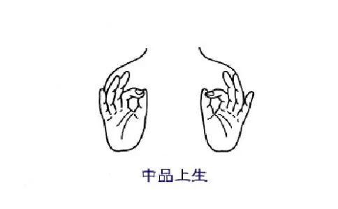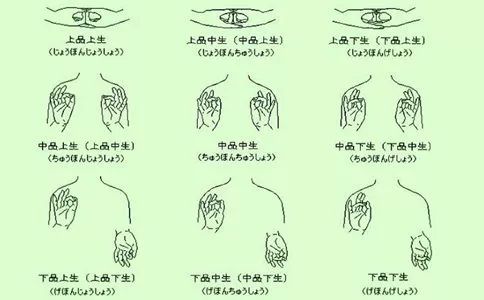 “品”是手掌的样式,根据手掌的位置的不同分为上、中、下三品。上品,手心向上相迭;中品,两手当胸两掌掌心向外并列;下品,掌心向外,右手向上,左手向下。“生”是手指的样式,上生为拇指、食指的指尖相连;中生为拇指、中指的指尖相连;下生”为拇指与无名指的指尖相连。“品”的三种样式和“生”的三种样式对应组合就组成了九品手印。